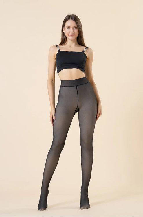 Our warm plush lined tights feature a soft thermal fleece velvet interior that traps heat without adding bulk. The high-waist design smooths your silhouette and stays in place, while the sheer outer layer mimics classic pantyhose for a refined look under any skirt or dress.